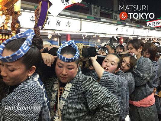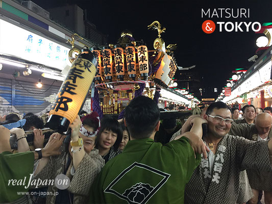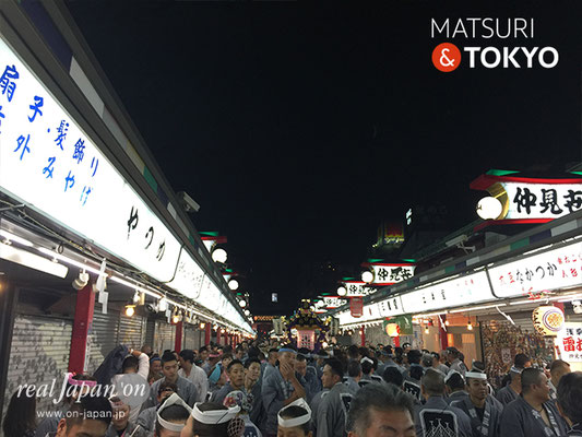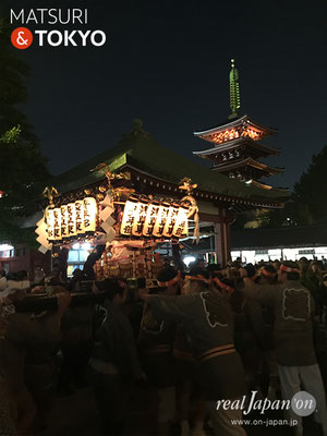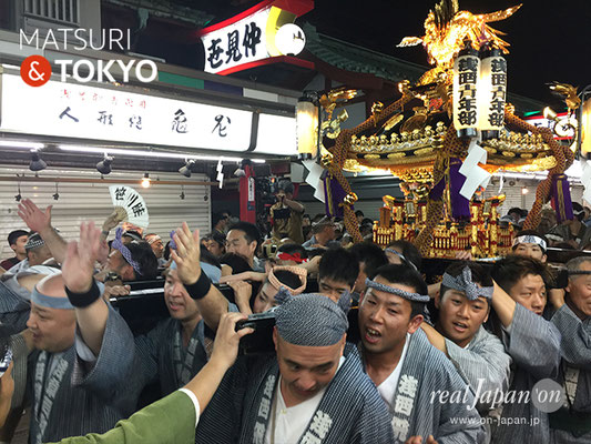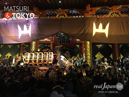 伝法院通りから浅草寺本堂に向かい宵宮渡御のクライマックスへ。道中の祭囃子と担ぎ手の声が、浅草らしく賑やかに威勢良く響き渡っていました。