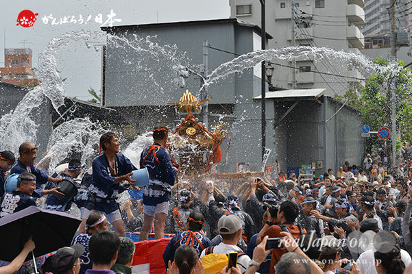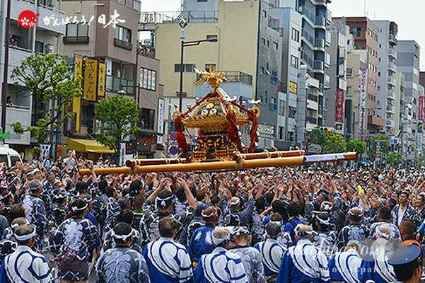 3年に一度の本祭りでは、全体では大小あわせて120数基の神輿が町内で渡御される。そのうち各町神輿連合渡御では、各町から53基の大神輿が早朝から集結し、永代通りを埋め尽くすと「わっしょい、わっしょい」の威勢の良い掛け声により全行程約8キロ、約10時間に渡って神輿が連合で渡御される。また、沿道の観衆やトラックの荷台、消防団の消火栓から担ぎ手めがけて容赦なく水が掛けられ、東京・夏の水掛け祭りとして親しまれている。
