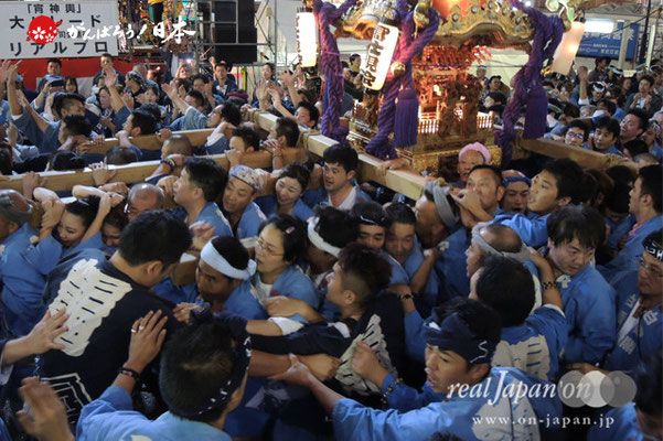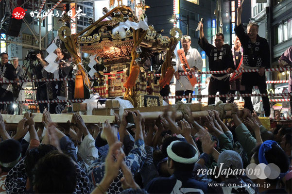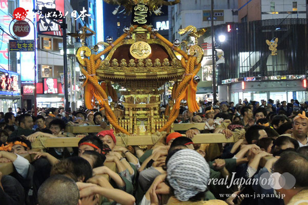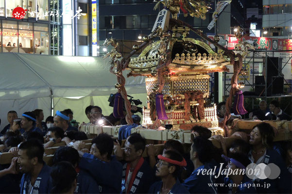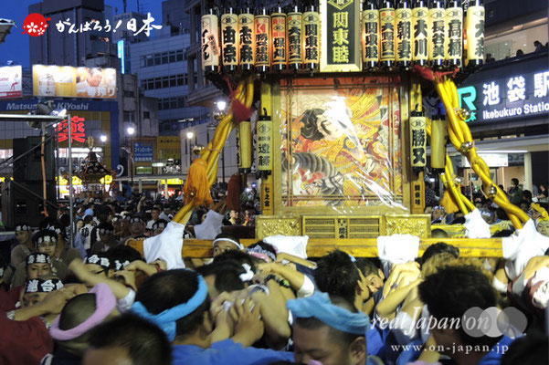 翌日、日曜日は池袋御嶽神社の例祭日として15町会・約30基による御輿パレードの後、クライマックスは西口界隈の町会、同好会の大御輿14基による盛大な「宵御輿パレード」が日暮れとともにスタートする。3000人とも言われる半纏を纏った威勢のいい多くの担ぎ手たちの熱気で池袋駅西口駅前広場が埋め尽くされる。