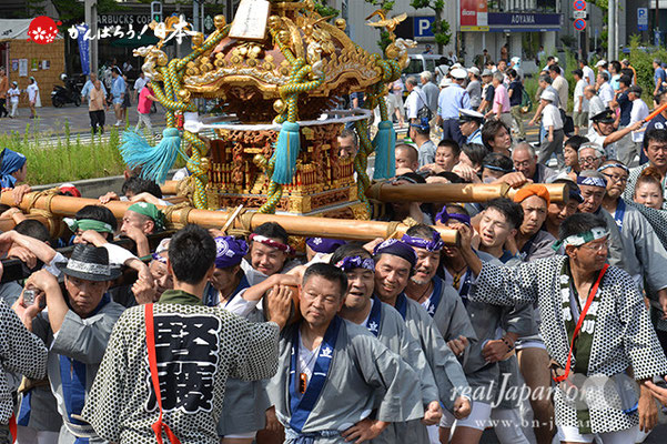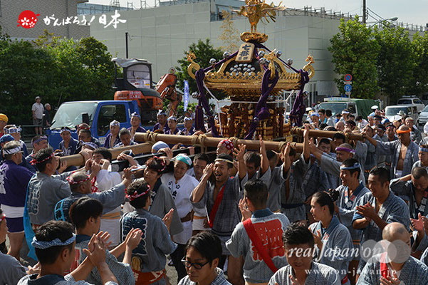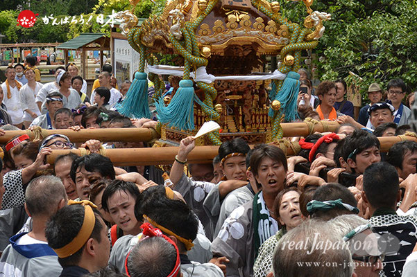 氏子地域を南部・西部・東部の3地区に分け、それぞれの地区から一斉に神社を目指して神輿が連合で渡御される。残暑厳しい夏空の下、氏子各町より25基の神輿が威勢良く宮入され、境内は興奮と熱気に包みこまれる。