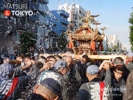 今から400年以上もの昔、この地を開拓した「深川八郎衛門」の名からついた「深川」地名発祥の地と言われる深川神明宮の3年に一度の本祭りでは、氏子12ヶ町の神輿が勢揃いして一斉に連合渡御される。「わっしょい、わっしょい」と勇ましい掛け声の担ぎ手めがけて、沿道からは豪快に水が掛けられる。また、前日には台座四尺四寸の千貫宮神輿が各町を渡って渡御された。